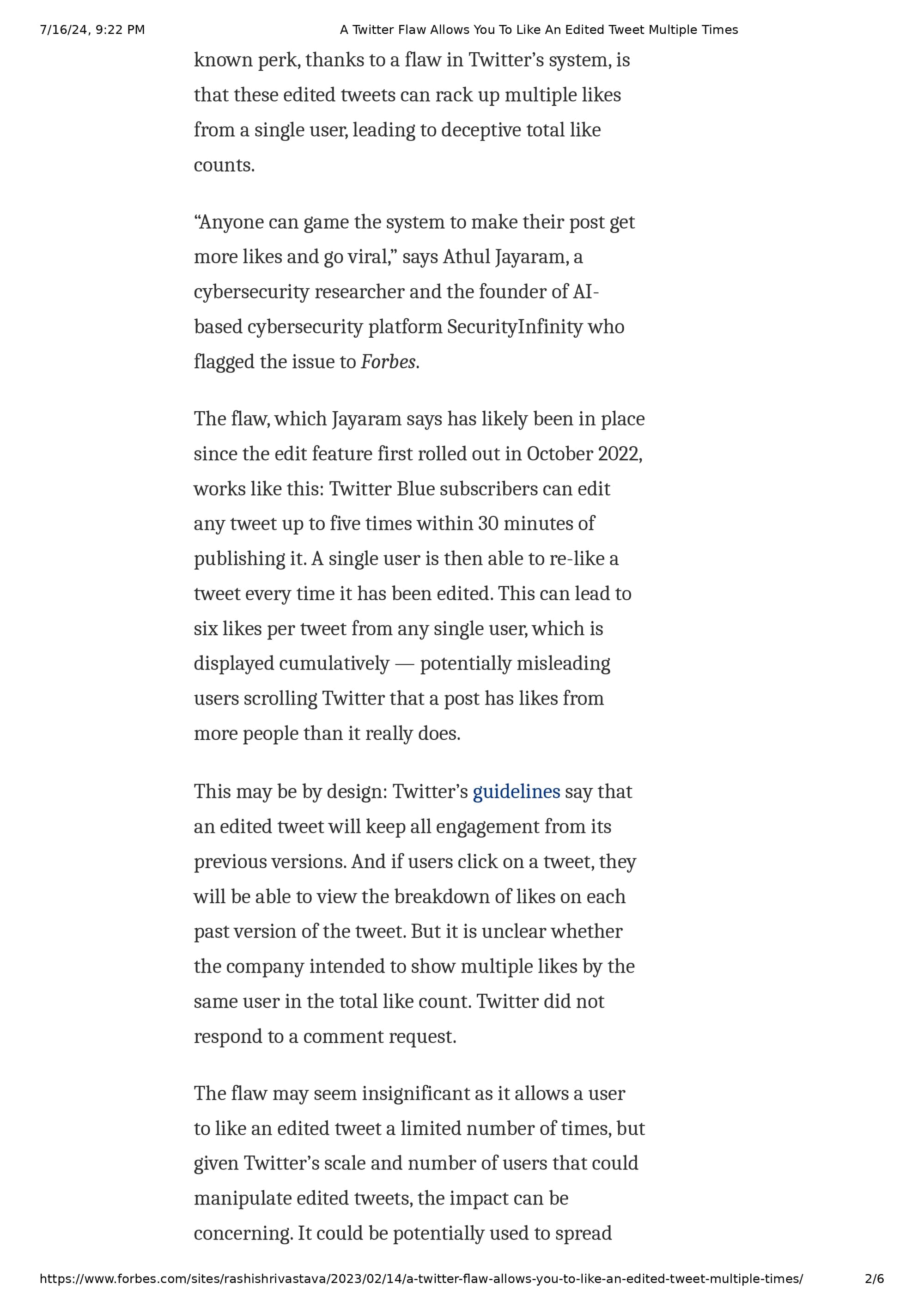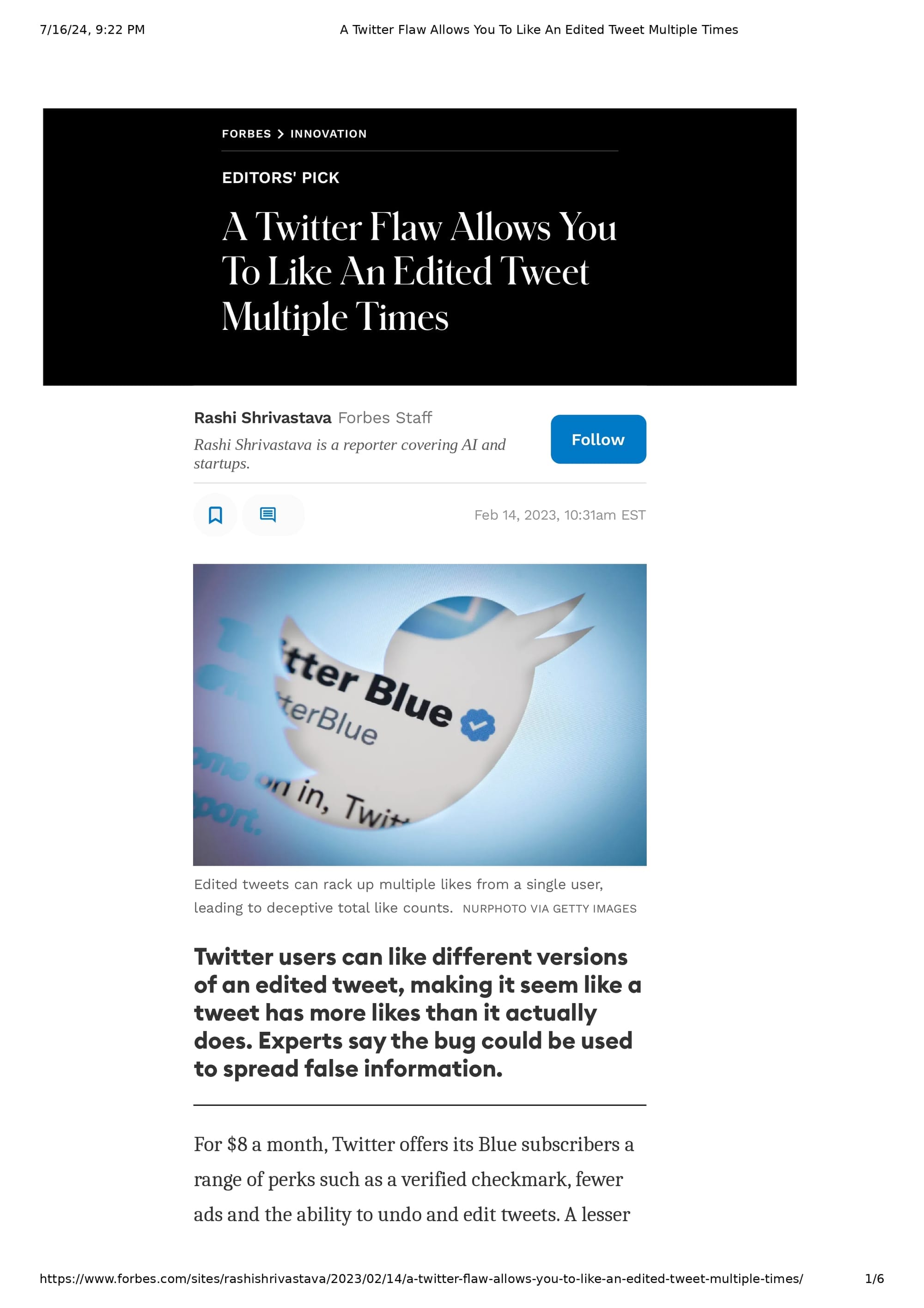 A Twitter Flaw Allows You To Like An Edited Tweet Multiple Times - Featured on Forbes