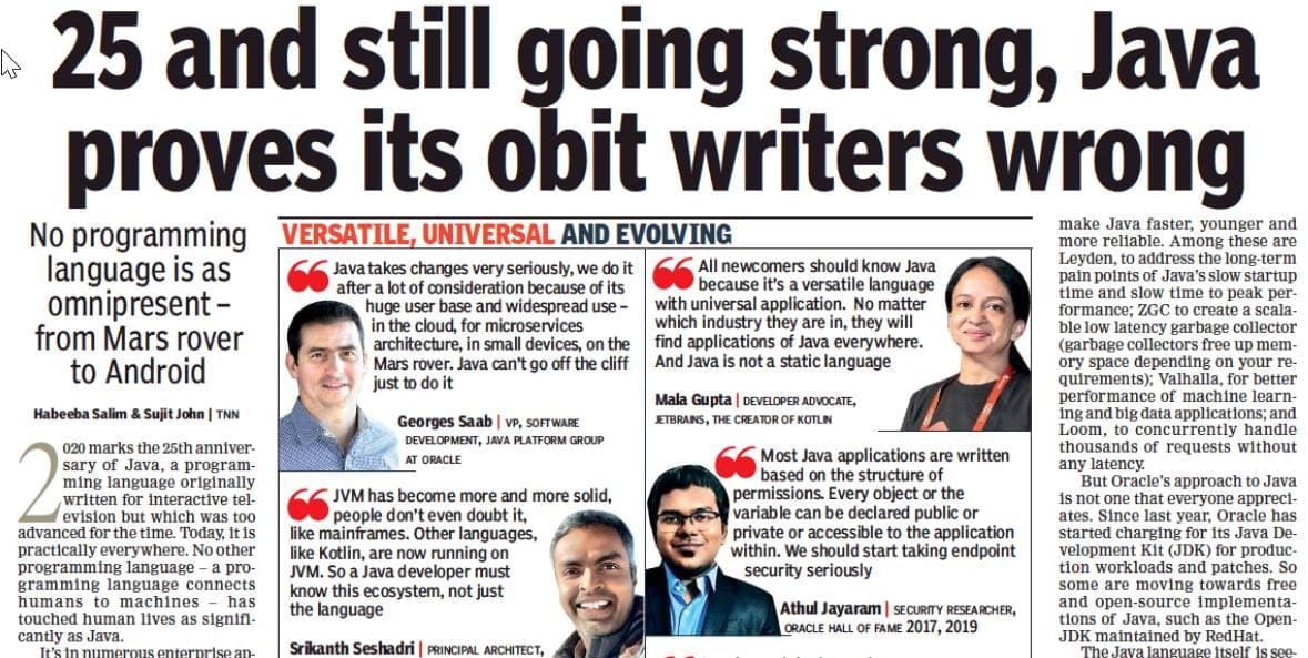 25 and still going strong, Java - Featured in Times of India Newspaper