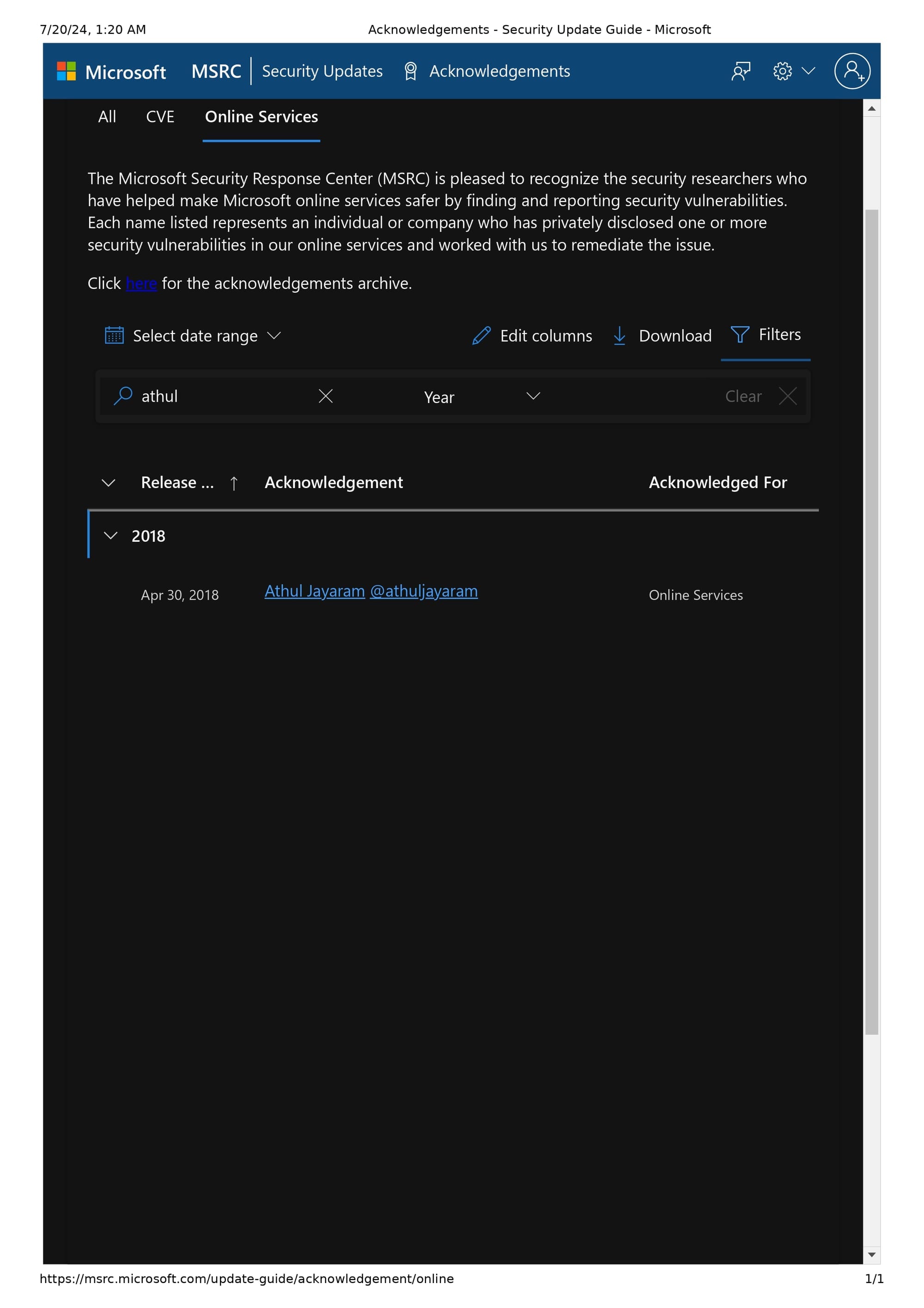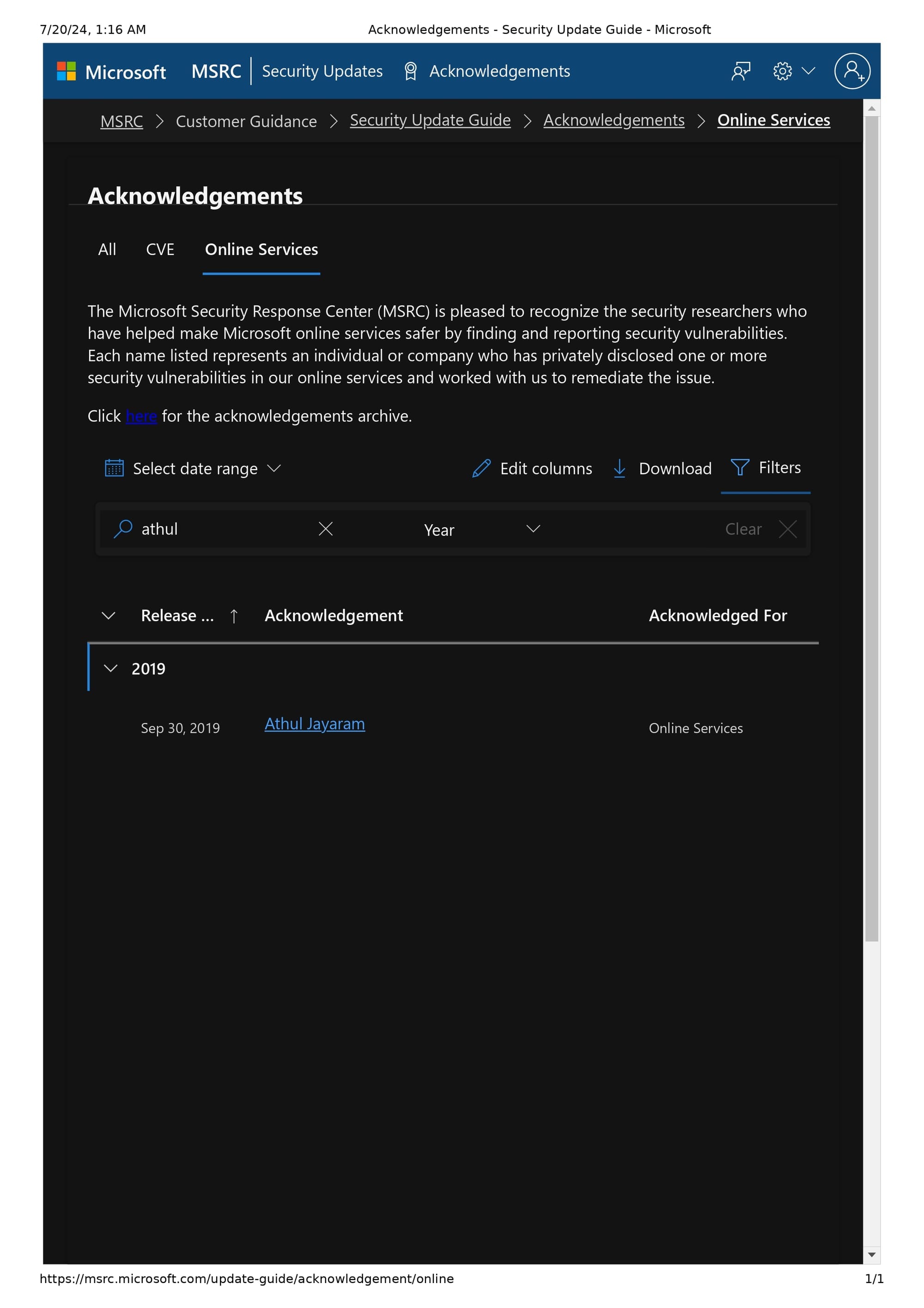 AthulMicrosoft Hall of FameAugust 4, 2024I am glad to get Hall of Fame from Microsoft multiple times in 2017, 2018 and 2019.