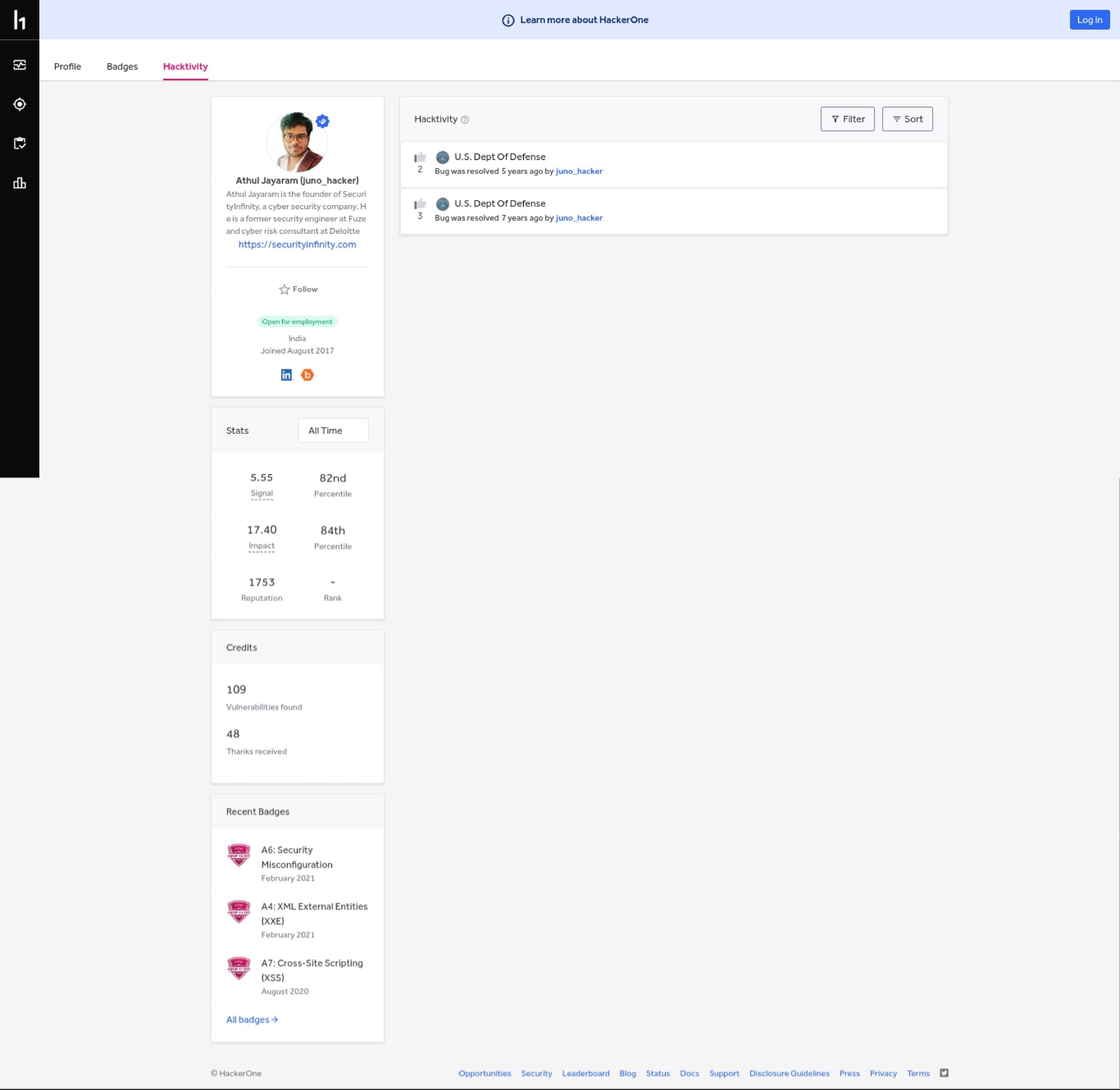 AthulUS DoD Defense Hall of FameAugust 4, 2024I had submitted 2 vulnerabilities to US DoD, Department of Defense and got hall of fame.