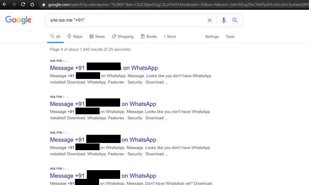 Similarly leaked whatsapp numbers of any country can be found using the google search query site:wa.me “<country_code>”